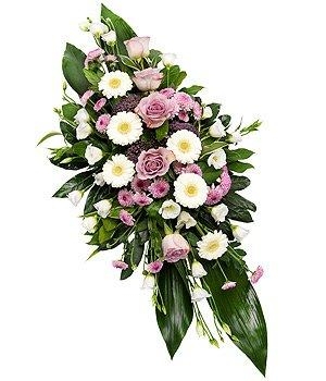 A double ended spray of lilac Roses, white Germini, Lisianthus, purple Trachelium and lavender Chrysanthemums.