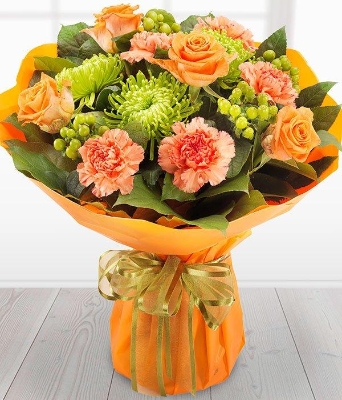 A simply sumptuous arrangement of orange Roses & Carnations mixed with luscious green Chrysanthemums and Hypericum Berries. Absolutely stunning.
